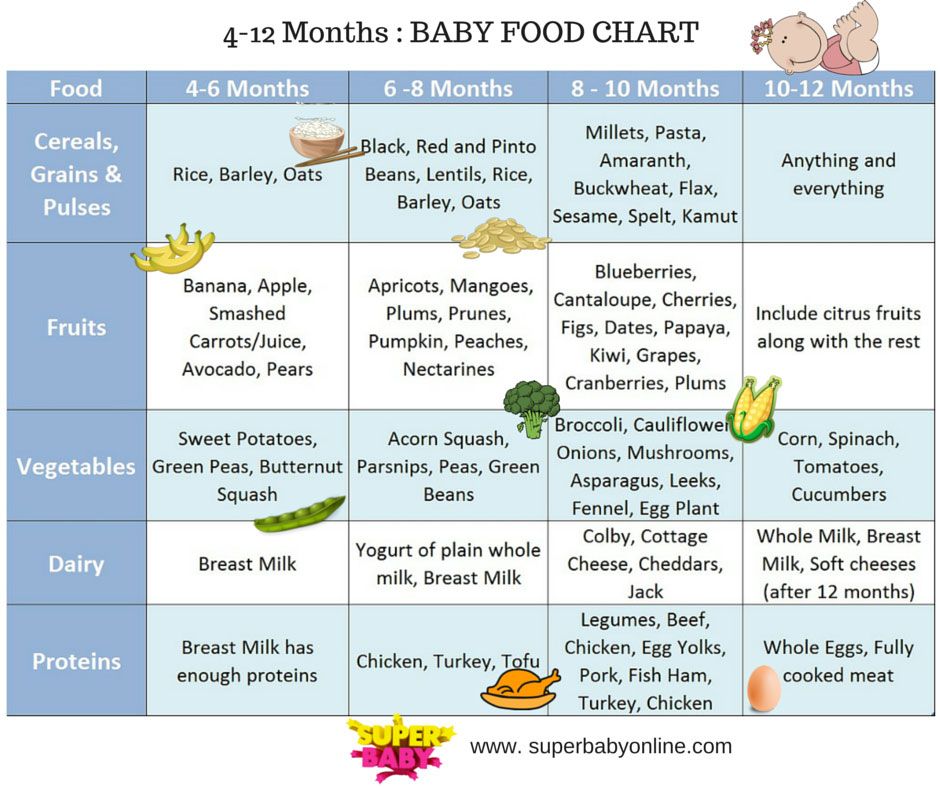 4 to 6 Months: At 4 to 6 months of age, infants have higher energy requirements and become capable of swallowing simple foods. Feed babies at this age baby cereal, mixed with breast milk or formula, twice a day. Start with 2 tablespoons of dry cereal mixed with enough breast milk or formula to hydrate the cereal. Gradually increase the amount of cereal to 4 tablespoons, mixed with breast milk or formula.